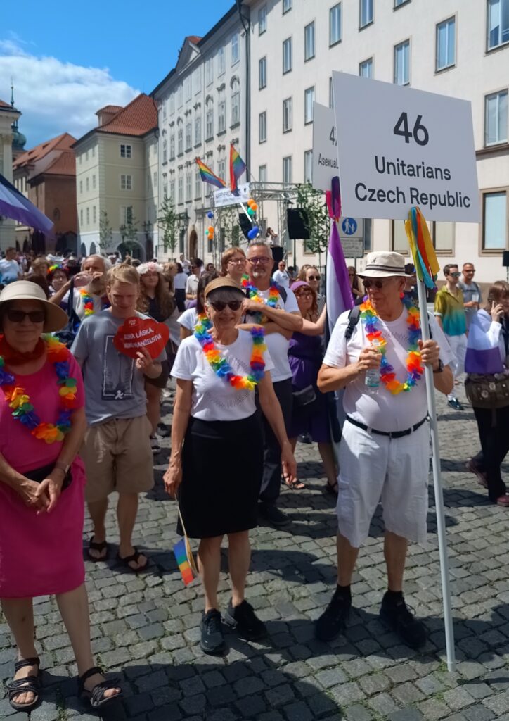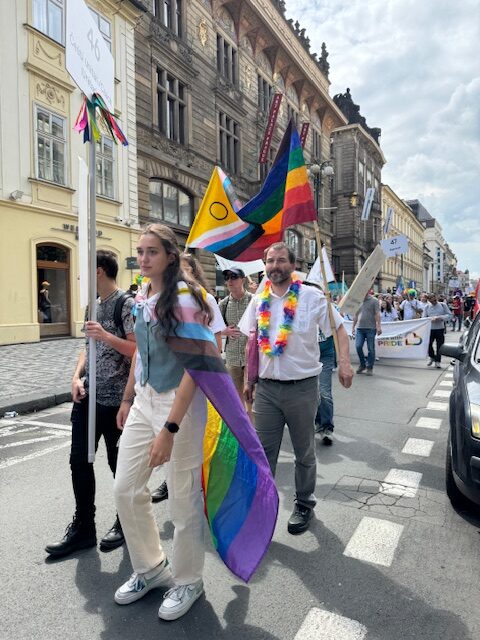Congregation members happily took part in Prague’s 2024 Pride Parade. Our members take part every year in the parade, and we hold a joint service with the Czech-language congregation the day after to commemorate our commitment to equal rights for all.